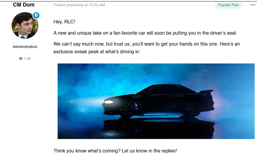 Amanecemos con la noticia que regresa una sorpresa, probablemente un auto colaborativo para que la membresia del club pueda customizar o una pieza especial con luces o electrónicos.